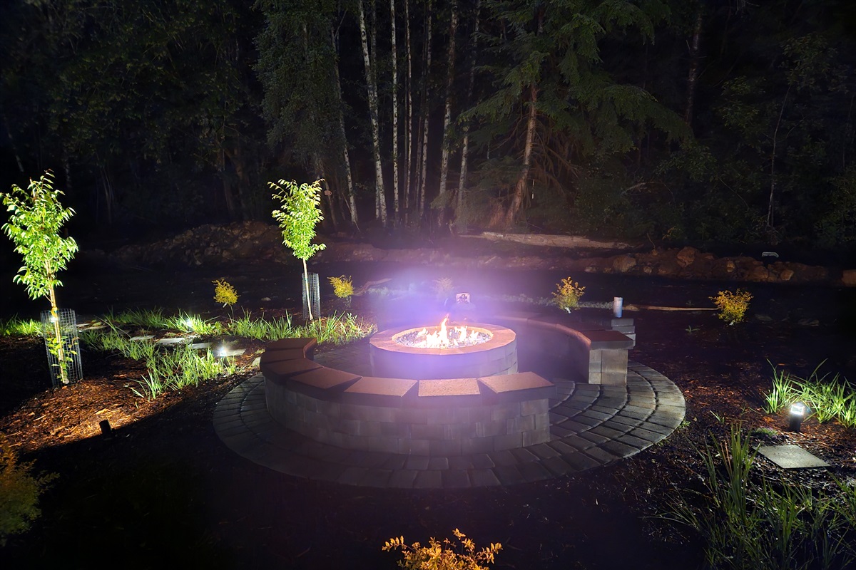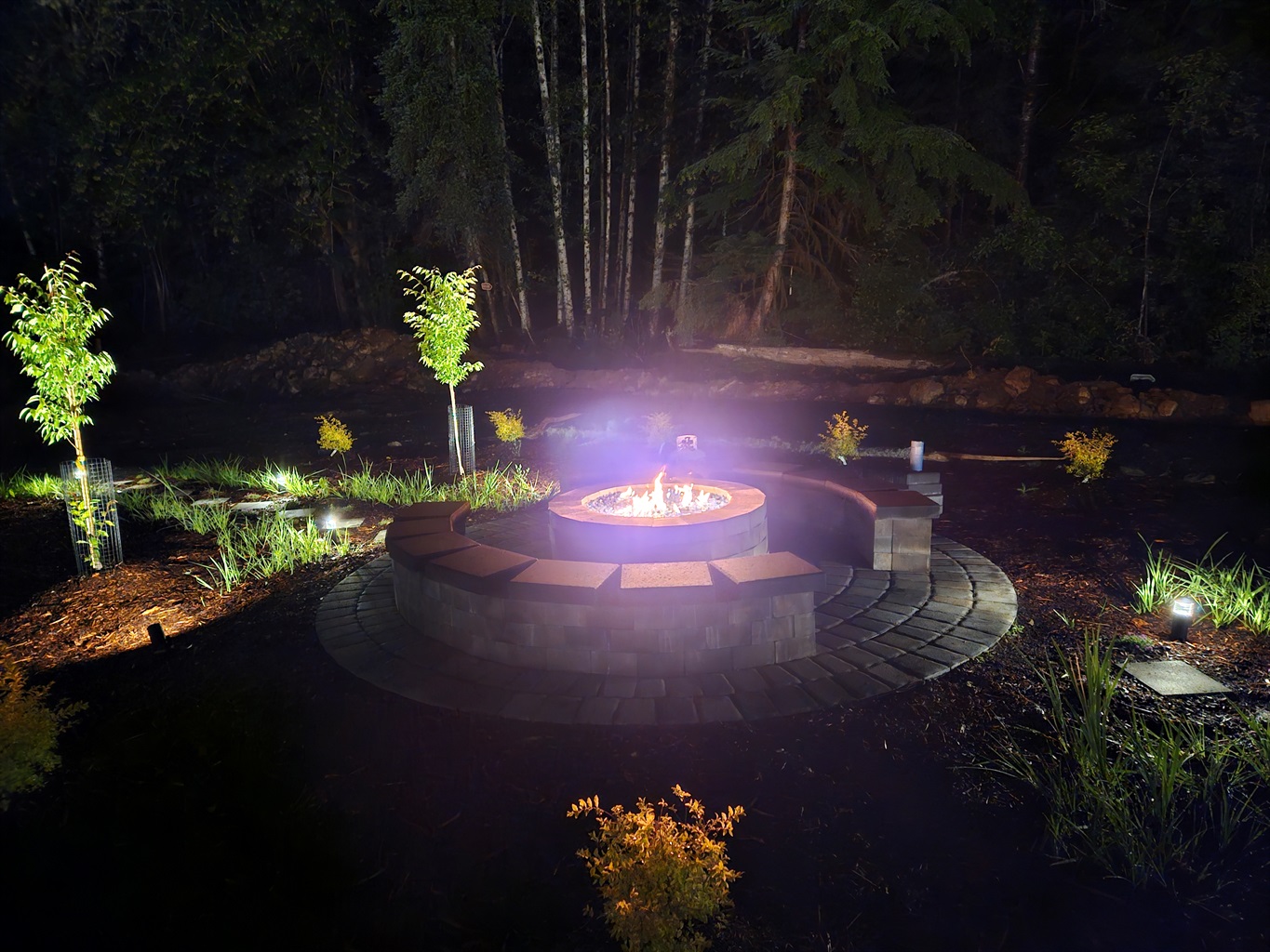 -- Propane-fueled stone fire pit with blue fire glass and half-moon stone seating